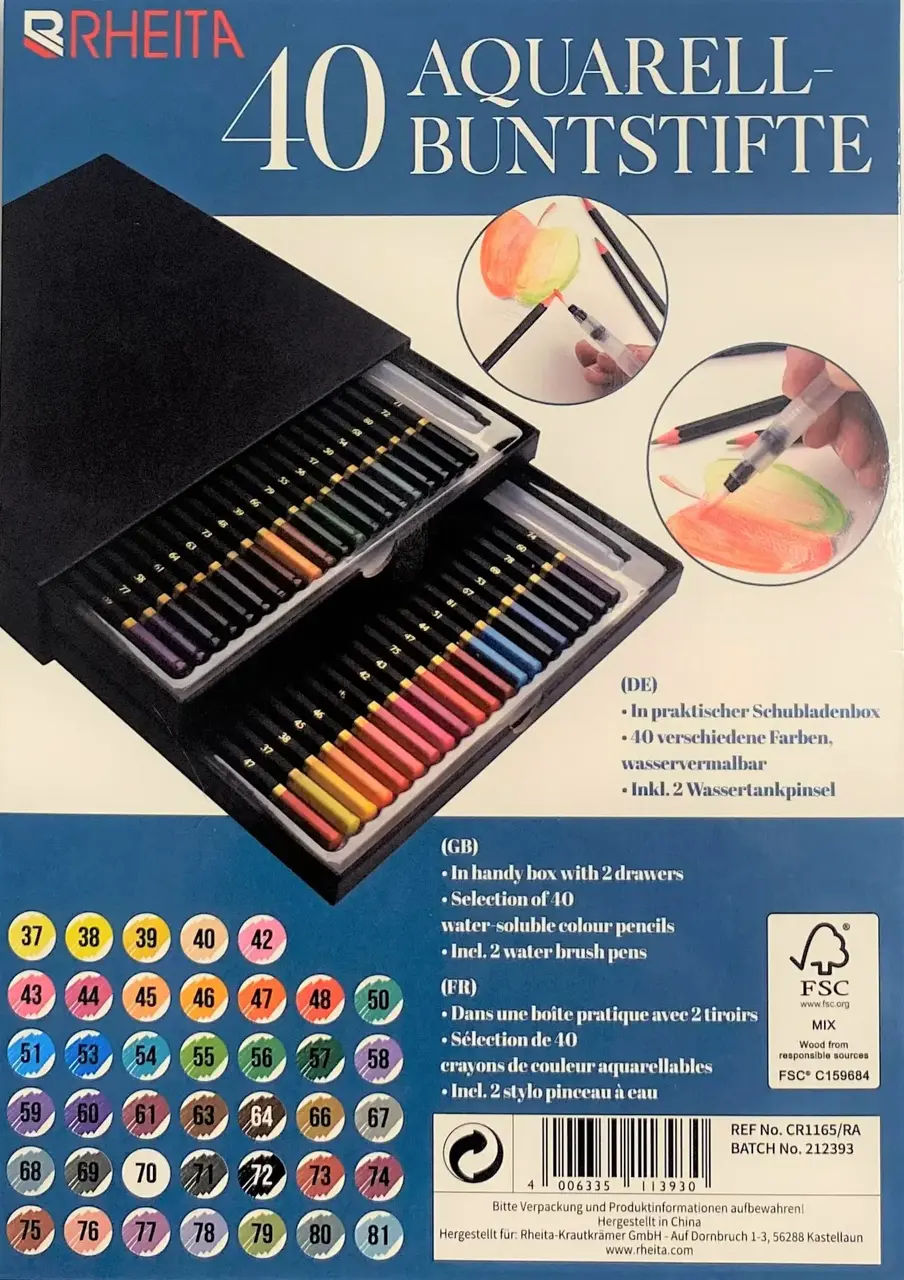 Die RHEITA Aquarellstifte Geschenkbox mit 40 Farben bietet eine hochwertige Auswahl an wasservermalbaren Künstlerstiften und ist ideal für kreative Projekte aller Art. Ob detailreiche Zeichnungen oder ausdrucksstarke Aquarelleffekte – diese Stifte überzeugen durch intensive Farben und vielseitige Einsatzmöglichkeiten.